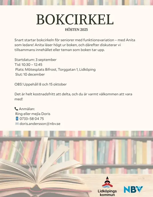 Snart startar bokcirkeln för senior med funktionsvariation - med Anita som ledare! Anita läser högt ur boken, och därefter diskuterar vi bokens innehåll eller temat som boken tar upp.