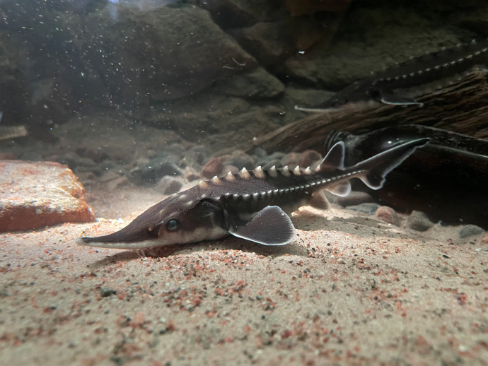 Atlantstör som bor på Vänermuseet innan den ska släppas ut i Göta älv.