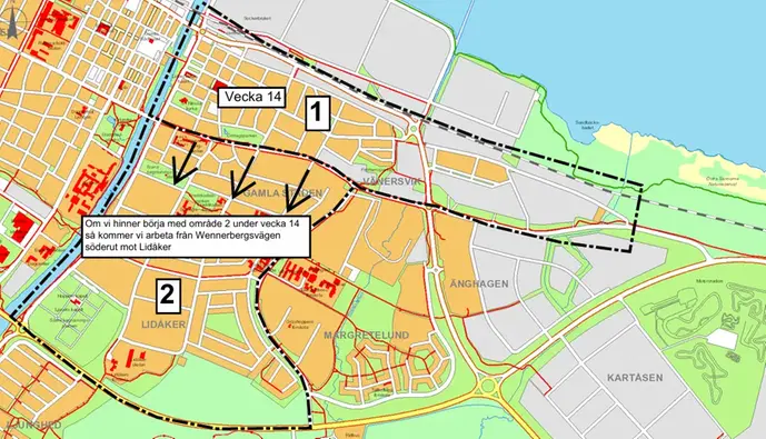 Vi städar område 2 i Nya staden, från Lidan mellan Esplanaden och Ringleden ut mot Lilleskog, Dalängen och Stubbehagens industriområde.