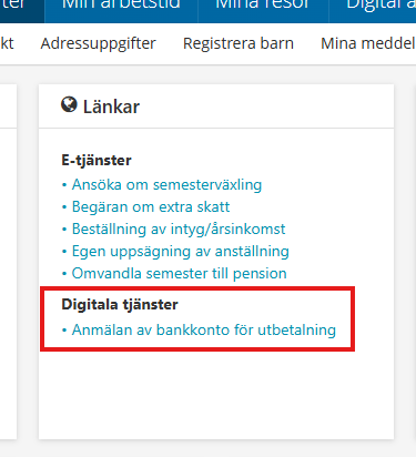 Kommunen betalar ut din lön via Swedbank. Det är viktigt att du registrerar det bankkonto som du vill att lönen ska betalas in på. Det gör du i Swedbanks kontoregister via denna länk, Kontoregister – anmäl konto | SUS | CSN | Avi | Swedbank Länk till annan webbplats.