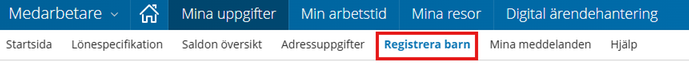 Om du är frånvarande för vård av barn (VAB) behöver du ha lagt in barnets personuppgifter i Medarbetarportalen. Om du inte gjort det kan vi som arbetsgivare inte registrera rätt frånvaroorsak. Klicka på rubriken Registrera barn i Medarbetarportalen.