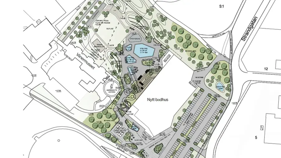 Den planerade badanläggningen är också en viktig del i utvecklingen av en helt ny stadsdel. I förslaget ingår tydliga kopplingar till Framnäs strandpark och närheten till Vänern. En grön vegetationsridå mellan parken och anläggningen föreslås bevaras, vilket skapar en naturlig övergång mellan utomhusbadet och omgivningen. Grönområden sparas och kompletteras med kullar som skyddar mot vind, och materialval i utomhusdelarna anpassas för barnfamiljer, lek och avkoppling och har tagits fram utifrån inspiration i närområdet. Entrémiljön ska vara välkomnande med planteringar, sittplatser, cykelparkeringar och gångvägar. Allt för att skapa en trivsam helhetsmiljö för invånare och besökare i alla åldrar.