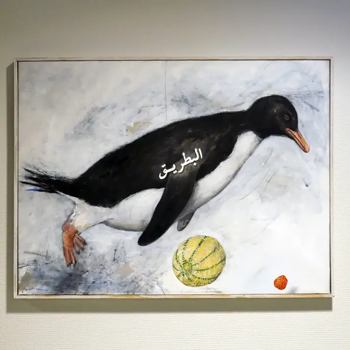 Oljemålningen som finns i Lidköpings kommuns konstsamling visar en pingvin som ser ut att sväva bland en melon och en jordgubbe. Mitt i tavlan står skriften البطريق – som på arabiska betyder just ”pingvin” – vilket tillför både ett grafiskt element och en tillika oväntad som oförklarad kulturell förskjutning.
