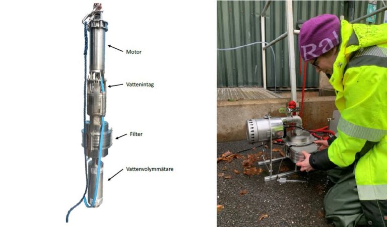 T.vä Den stora högvolymspumpen, ca 1,6 m lång, består av en motor placerad högst upp, följt av ett intag för vatten, en filterstack med plats för tre filter, och en elektromagnetisk flödesmätare längst ner som mäter vattenvolymen med hög precision. T.hö Den lilla högvolymspumpen är utrustad med samma filterstack som den stora pumpen och en ram som gör att den kan placeras på botten i grundare vattendrag.