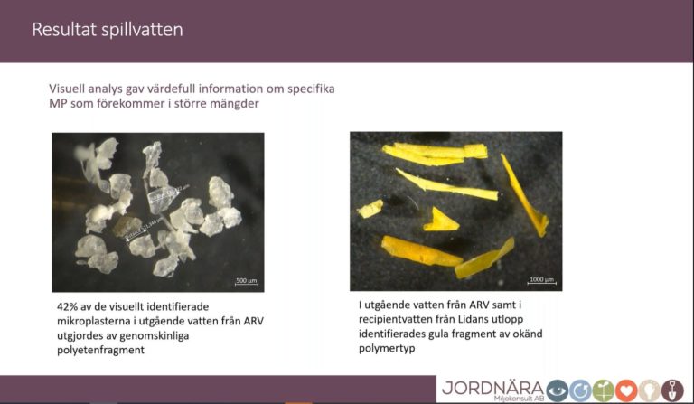 Vad kan då visuella karaktäriseringen berätta om källor? Anna avslutade med att förklara varför visuell karaktärisering är viktig och använde resultat från Svartån i Örebro som exempel. Sfärer, filmer och filament kan ge en fingervisning om varifrån mikroplasten uppkommit så man kan härleda källan.