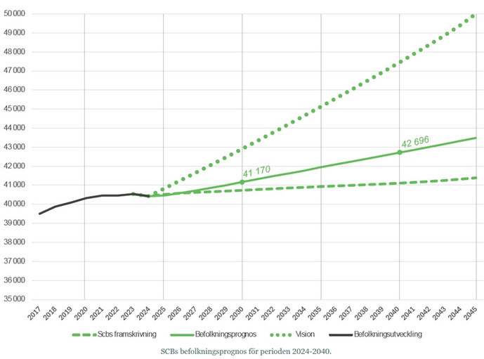 Kommunen tar varje år fram en uppdaterad befolkningsprognos. Prognoserna tas fram utifrån SCBs befolkningsframskrivning plus antaganden om framtiden utifrån bostadsmarknadsanalys och pågående projekt med mera. Enligt prognosen kommer vi vara 41 170 personer 2030 och 42 696 personer 2040.