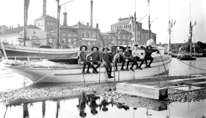 Sju pojkar i scoutdräkter fotograferas på en båt i västra hamnen. De ingick i den då nybildade gruppen Lidköpings Riddarpojkar, som senare utvecklades till att bli Lidköpings Scoutkår. I bakgrunden syns Lidköpings bryggeri. Bilden är tagen 21 maj år 1910. Fotograf: Okänd.