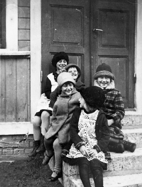 Här sitter systrarna Holm med sina kamrater på en trappa i kvarteret Leoparden någon gång under 1930-talet. Det är nog kyligt ute eftersom flickorna bär både kappa och hatt. Humöret är på topp och de verkar vara glada att få vara med på fotografi.