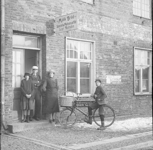 Innan de stora varuhusen etablerades i Lidköping präglades staden av många mindre butiker som specerier, bagerier, charkuterier och mjölkbutiker. Ofta fick kunderna ta sig till olika butiker för att handla alla matvaror som behövdes i hushållet. I Ivar Rohdins mjölk- och speceriaffär på Kållandsgatan 22 kunde man dock köpa både torrvaror, mjölkprodukter och bröd. På bilden syns en springpojke som troligtvis har levererat färskt bröd från Westerståhls bageri.