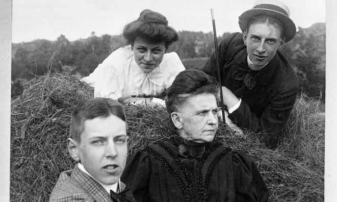 How many people can we fit in one haystack? At least four. Gösta Falkengren wears a hat. At the very front of the photo we find his brother Uno Falkengren, a reknown photographer during his time. The woman in black is their aunt Ottonie Falkengren. The name of the lady in white is however unknown. The picture is dated to early 20th century. You get a chance to get to know Uno better in the exhibition Berättelser från Lidköping (Stories from Lidköping).