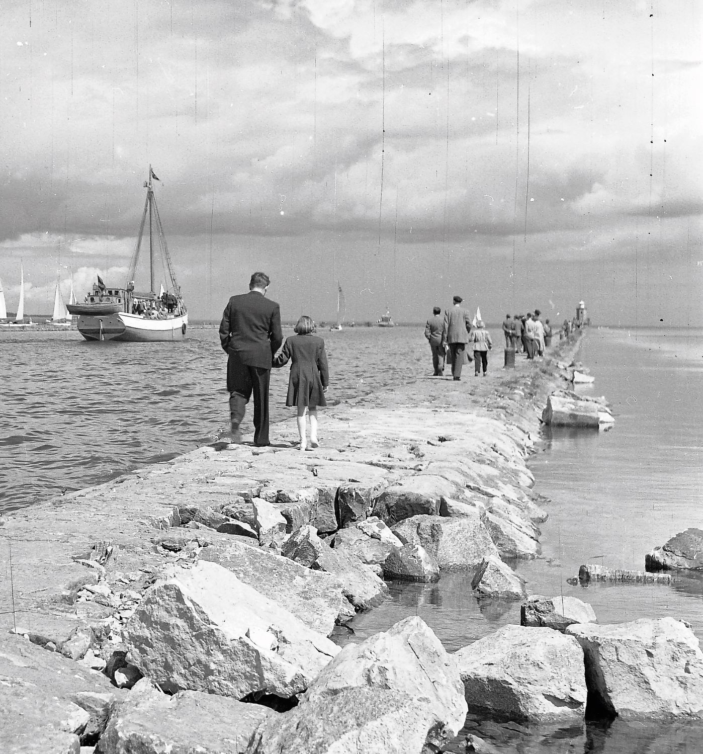 Vy från östra piren i Lidköping med segelfartyg och segelbåtar i bakgrunden, möjligtvis under en kappsegling där folket på bilden är på väg ut mot de bästa åskådarplatserna. Gunnar Hoflund, som tog många bilder på Lidköping under 1940- och 1950-talet, ställer sig för att plåta åskådarnas ryggar.