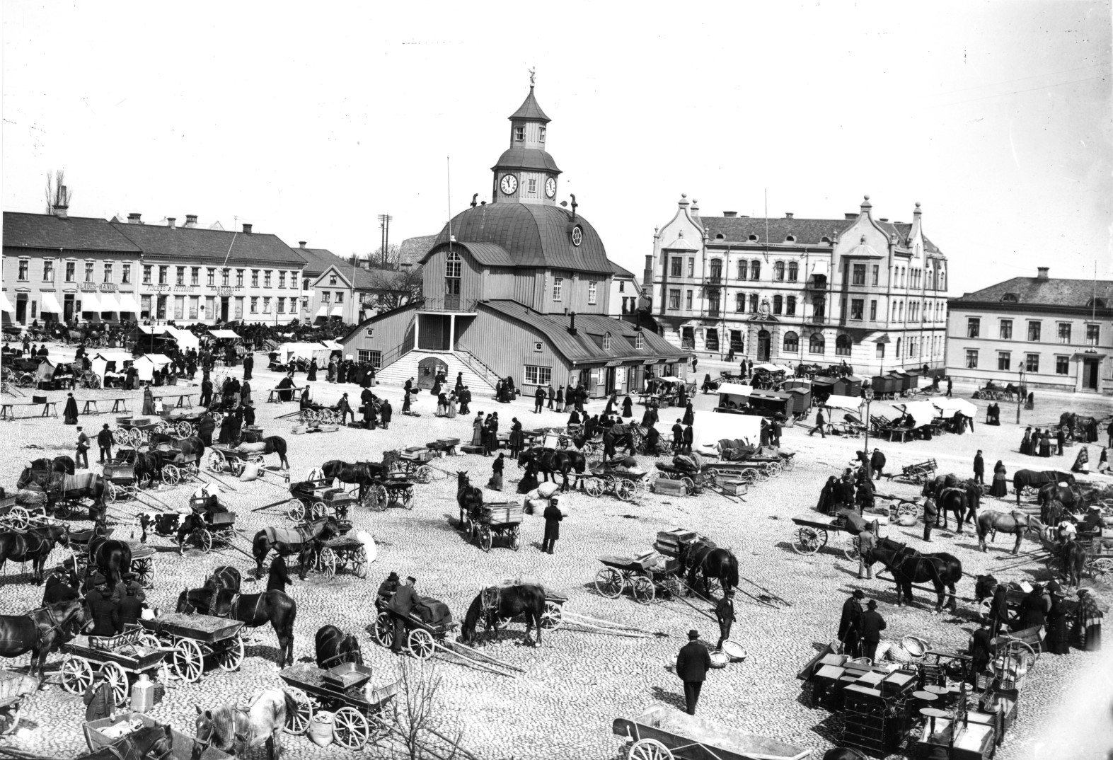 Dofter och ljud från landet möter staden. Det är fullt med folk, boskap och vad säsongen erbjuder. Marknadsdagarna på Nya stadens torg, på bild omkring år 1900, har länge satt prägel på staden. Att lördag är torgdag i Lidköping bestämdes år 1470. Fotograf: Werner Lindhe.