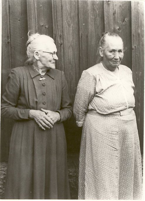 På fotografiet från 1950-talet syns vännerna Ellen Gustavsson Hyllingsund (1883), född Kunkell, och Tilda Jansson (1888) från Kållandsö. De ägde var sin eka och brukade ro över sundet mellan Spårön och Strö för att träffas och umgås med varandra. Ellen försörjde sig bland annat med att tvätta åt folk i trakten och Tilda fiskade med ryssjor. Tillsammans brukade de även arbeta i trädgården hos Haldan Nilsson-Dag vid hans sommarhus i Strö. Fotograf: Okänd