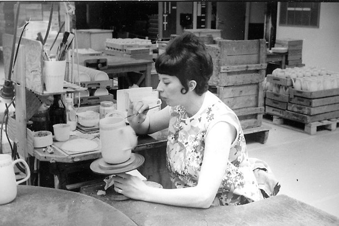 Att vara porslinsmålare på Rörstrands porslinsfabrik under 1900-talets mitt krävde precision och noggrannhet. Helga Torstensson började arbeta på fabriken redan som 15-åring och fick tidigt lära sig måla för hand och randmåla på maskin, arbeta med tryckta dekorer och dekorera med guld och platina. Hon arbetade på fabriken under totalt närmare 40 år innan hon gick i pension. Fotograf: Okänd.